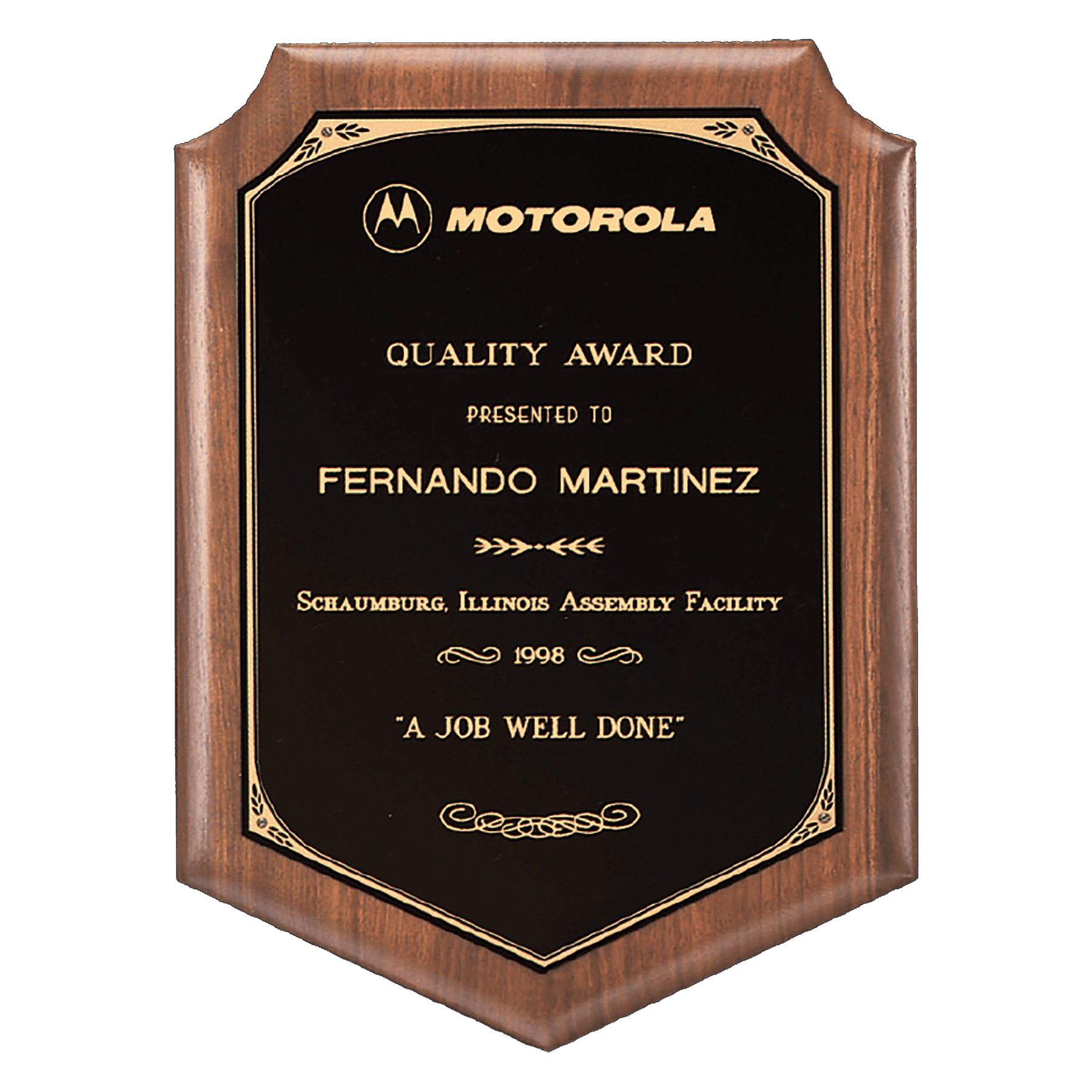 This American Walnut plaque features a unique shape with a gold bordered laserable black brass plate with the same profile. Keyholed on the back for hanging, this American made award is an elegant variation of a timeless traditional award for recognition of achievement or milestones reached.