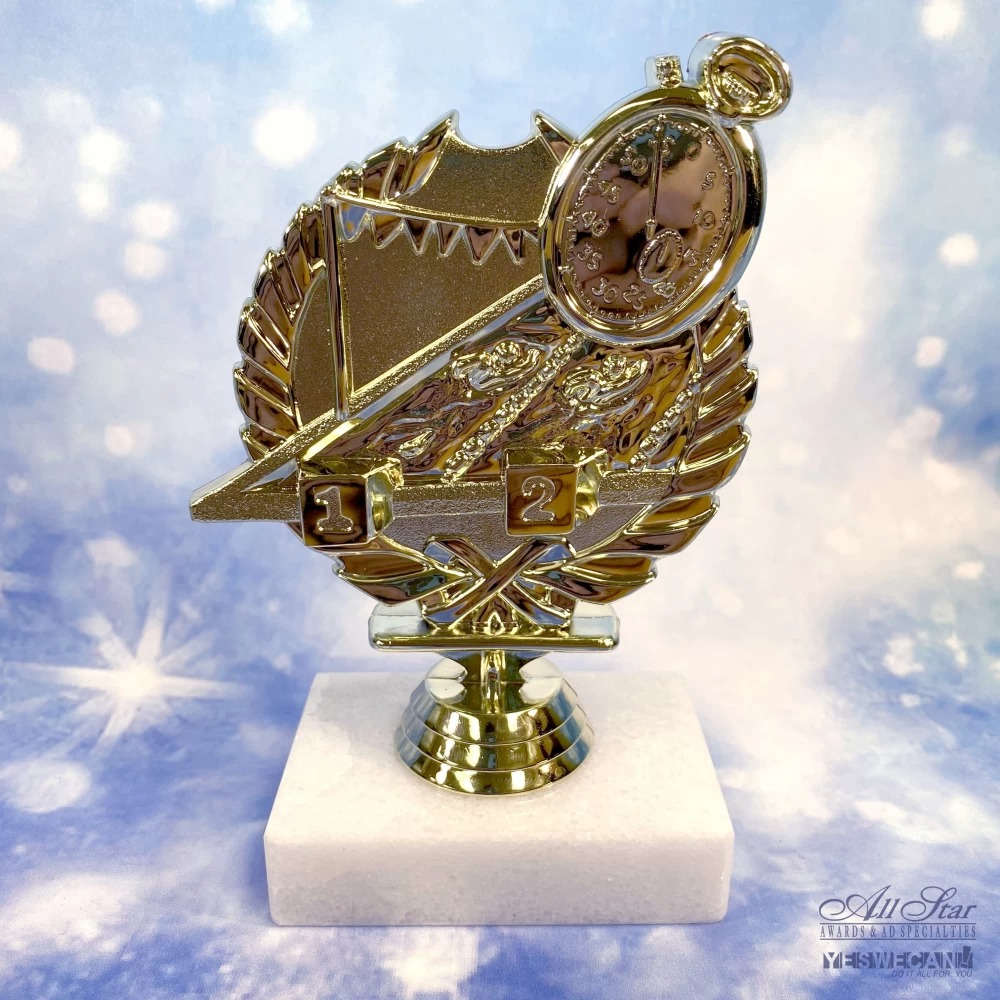 Swimming Wreath Montage - A1 -Recognize an individual with this swimming trophy! This trophy features a gold figure on a base of your choosing. This trophy includes a gold aluminum plate for engraving.